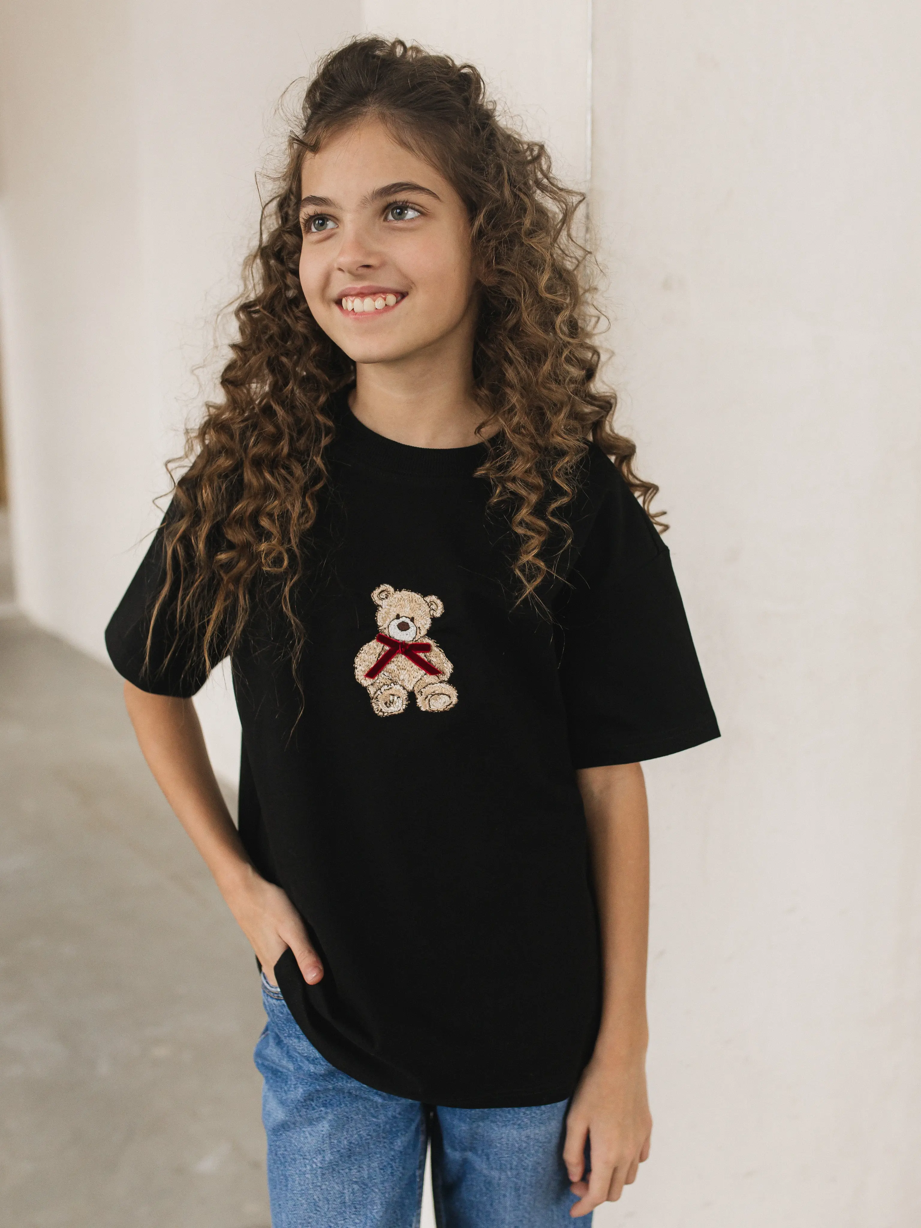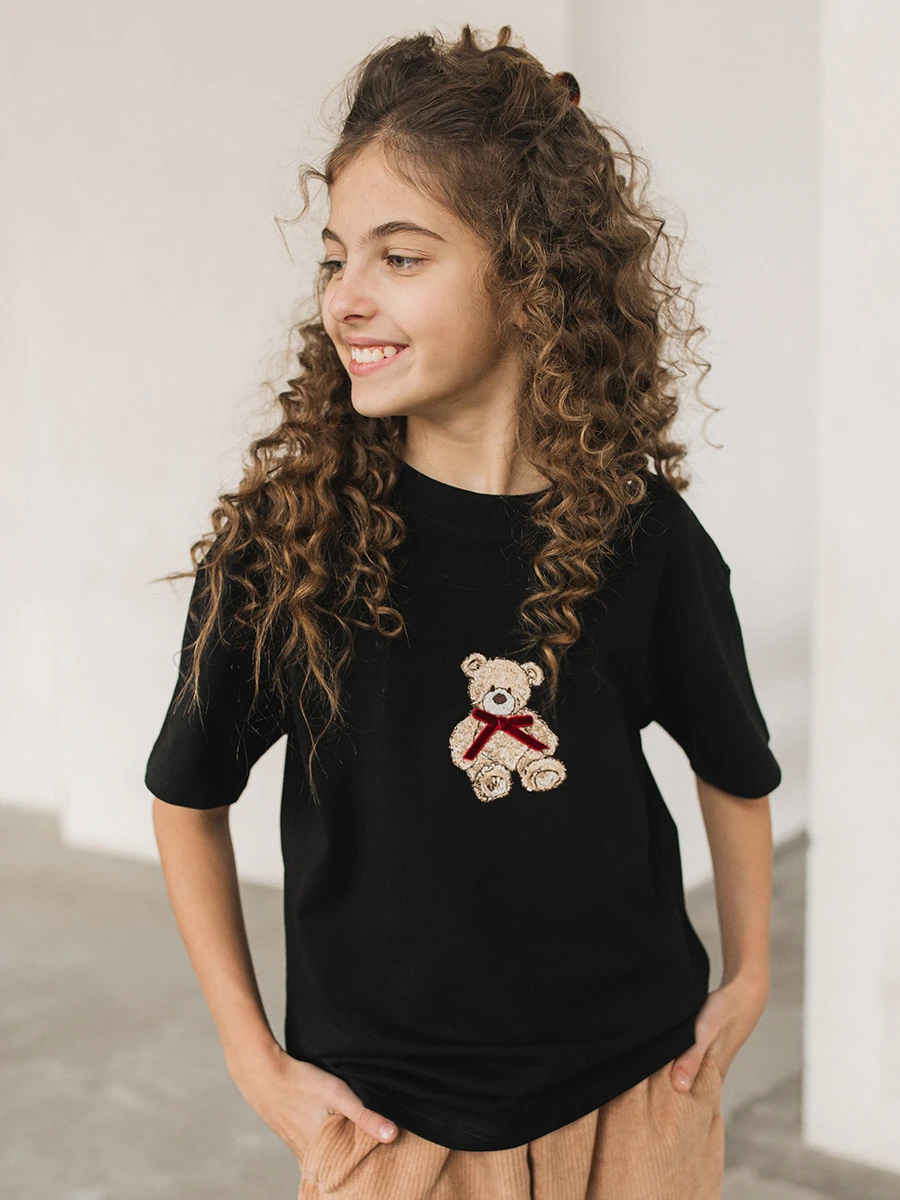 Стильная черная футболка для девочки артикул 6485 — это удачное сочетание комфорта, качества и современного дизайна. Модель выполнена из мягкого, приятного к телу материала, который отлично держит форму и подходит для ежедневной носки. Главный акцент — аккуратная вышивка медвежонка, создающая милый и запоминающийся образ. Такая футболка легко вписывается в гардероб ребенка и подходит как для прогулок, так и для детского сада или школы.
