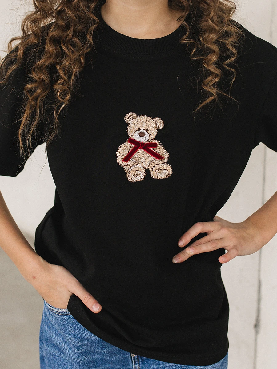 Футболка имеет классический прямой крой, удобную посадку и прочные швы, что делает ее практичной и долговечной. Черный цвет универсален и не маркий, а вышивка выполнена на профессиональном оборудовании, что гарантирует стойкость и аккуратность рисунка. Модель востребована в розничных магазинах и на маркетплейсах благодаря привлекательному дизайну и высокому качеству исполнения.