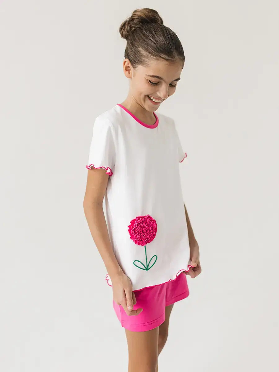 - Цвета: футболка — белая с горловиной фуксия и пришивным цветочком фуксия; шорты — фуксия.