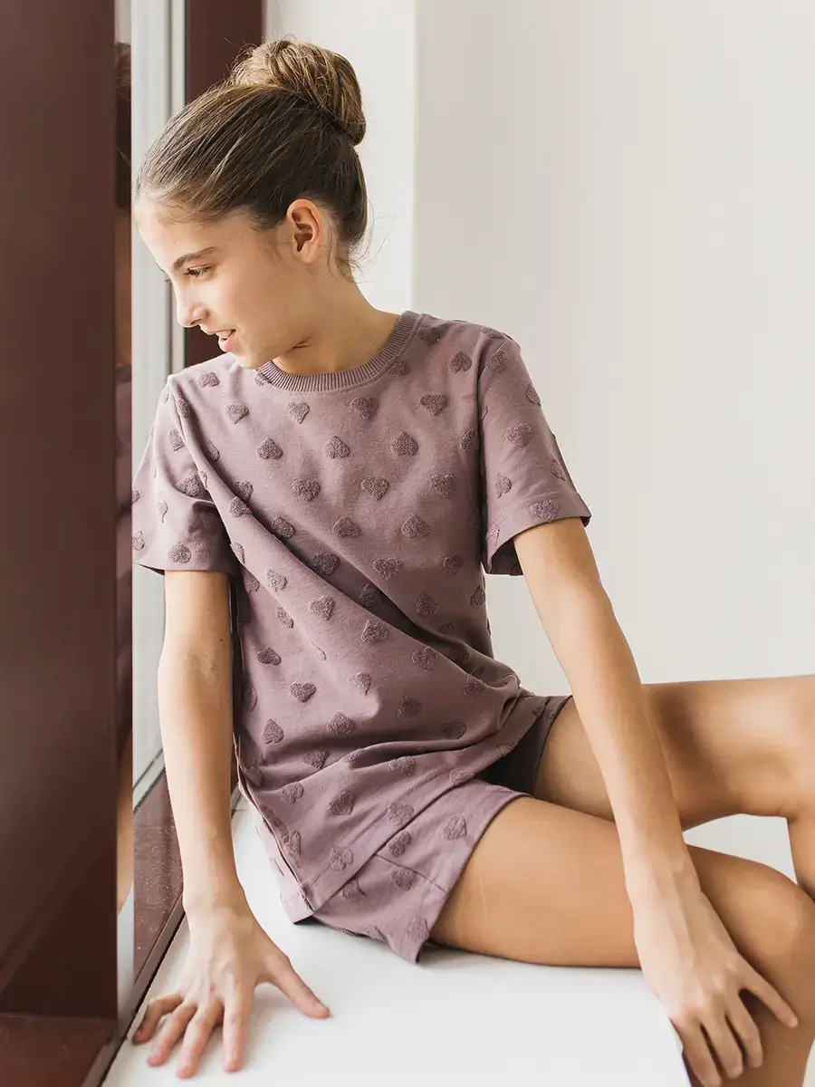Ткань Премиум-класса: Использован натуральный кулир-жаккард (хлопок с небольшой добавкой лайкры) — легкое, дышащее полотно с рельефным, тактильно приятным рисунком в виде сердечек.