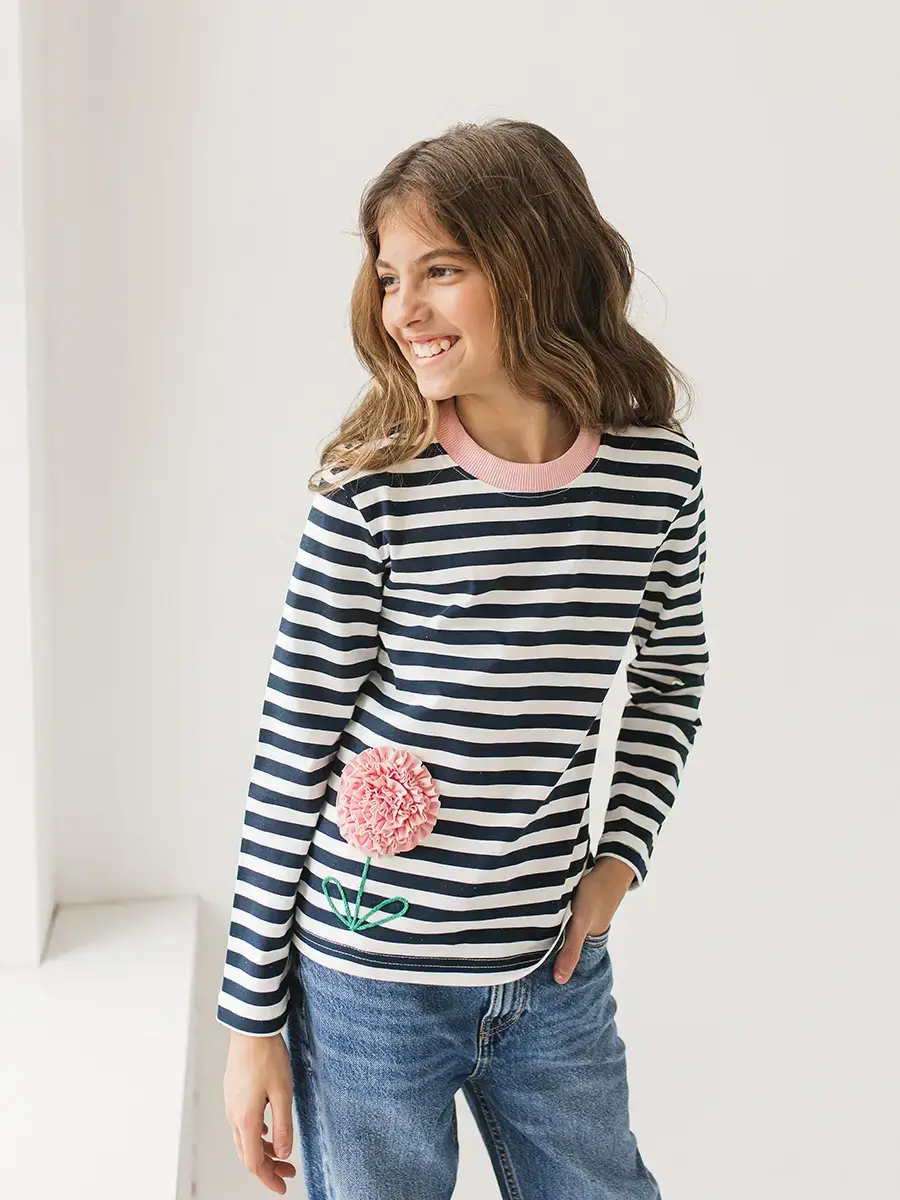 Контрастный декоративный цветок делает лонгслив более нарядным, сохраняя при этом универсальность базовой полоски. Модель сидит удобно, не стесняет движений и сохраняет форму после стирок.