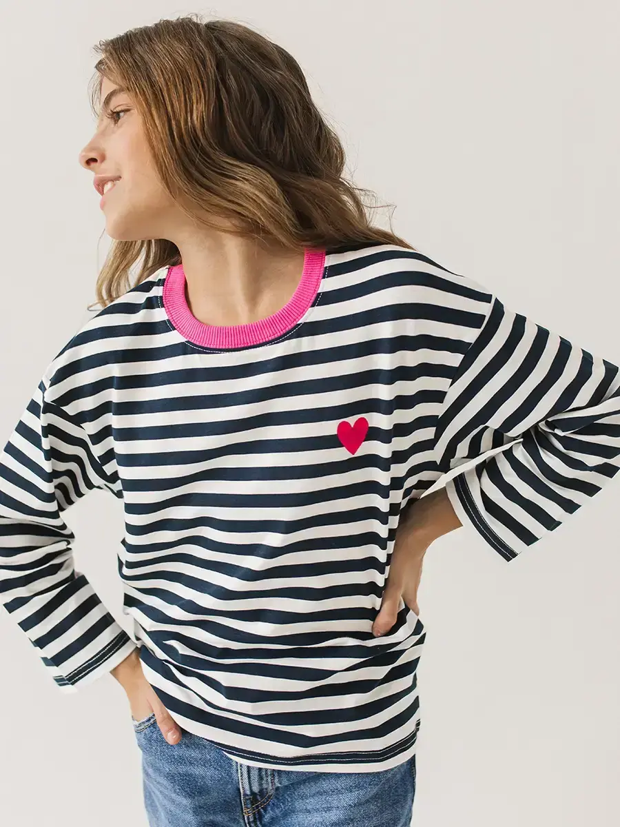 Лонгслив в морскую полоску для девочки с аккуратной вышивкой в форме сердца. Контрастная горловина и сердце — насыщенный цвет фуксия, который выгодно подчёркивает модель. Оптовая модель от производителя «Божья Коровка» — отличное решение для детских коллекций в розницу и мультибрендовых линеек.