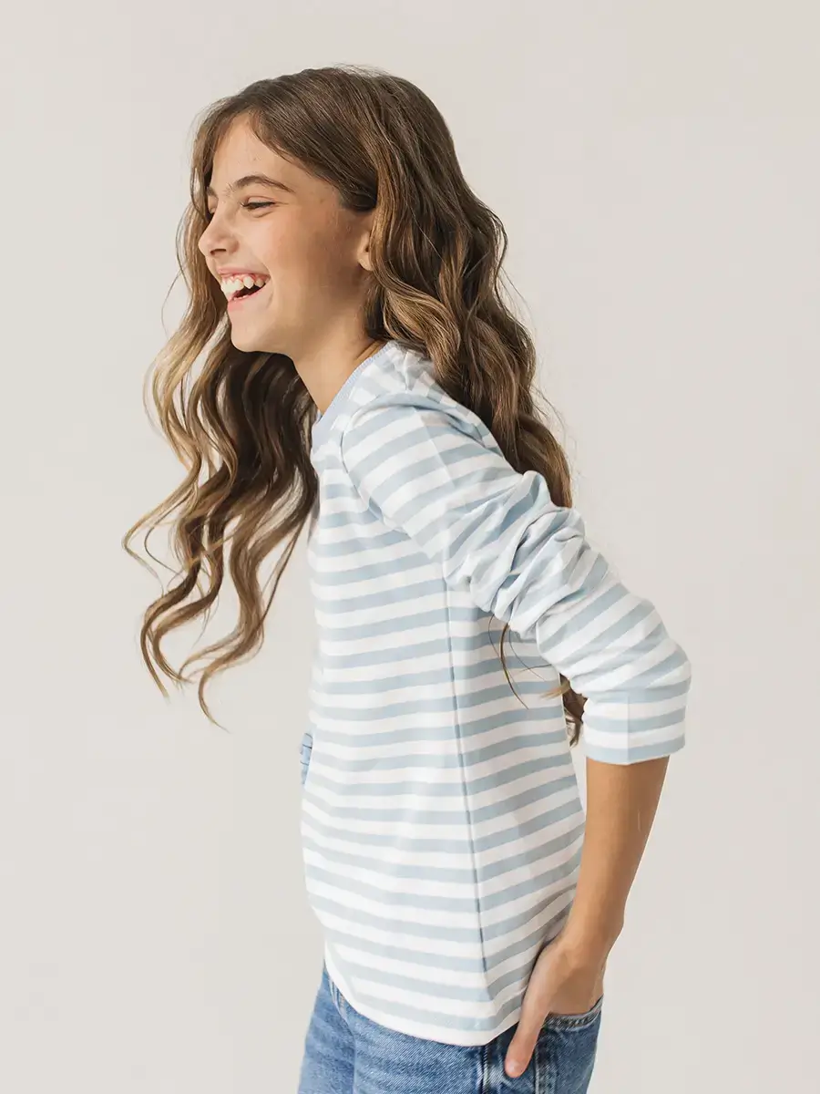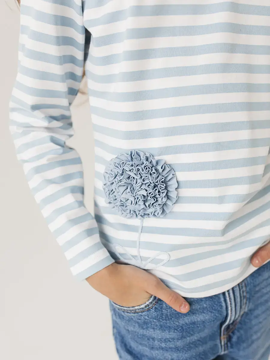 Морской бриз в гардеробе! Лонгслив в классическую бело-голубую полоску с пришивным элементом в виде объёмного цветка — must-have для весенне-летнего ассортимента. Натуральный хлопок!