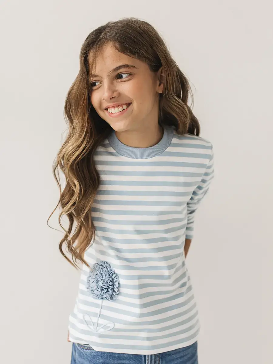 Лонгслив в бело-голубую полоску с цветком для девочки — оптом от производителя Божья Коровка